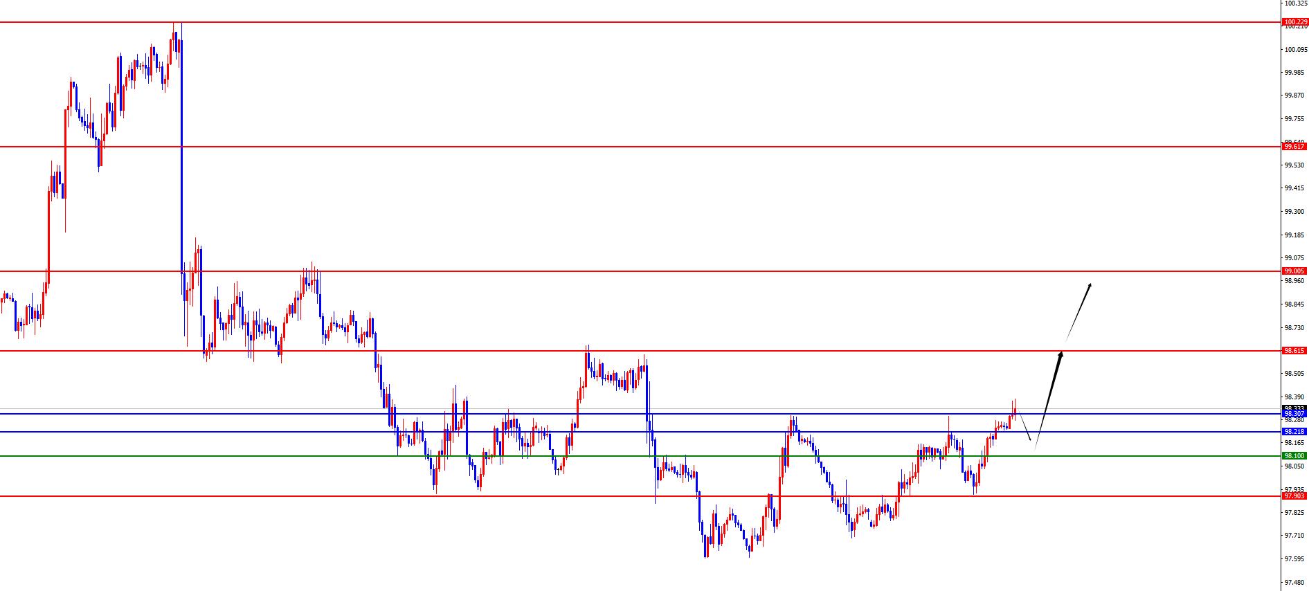 From a multi-cycle analysis, the weekly level has recently been supported by the weekly support up and down. This week, the focus is on the 98.30 position to stabilize. Once it stands firm, the medium-term bulls will continue to rise. At the daily level, last week, the price suppressed the daily resistance position and continued to fluctuate below the daily resistance position. Currently, the daily resistance is at 98.20. The price is more xm217.commonly treated with the band above this position. From the four-hour perspective, the four-hour perspective is the key to our emphasis on short-term price trends. After the price rose on Monday, it continued to rise based on the four-hour support yesterday. Currently, the four-hour support is in the 98.10 area, and the price is more treated above this position. Based on the multi-cycle view, the price will continue to pay attention to the upward trend in the range of 98.10-30, and the subsequent focus will be on further continuation of bulls.