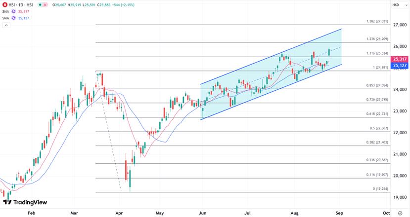 XM Hong Kong stocks: The prospect of external interest rate cuts is clear, the Hang Seng Index hit a high of 4 years and pointed to the 26000 mark