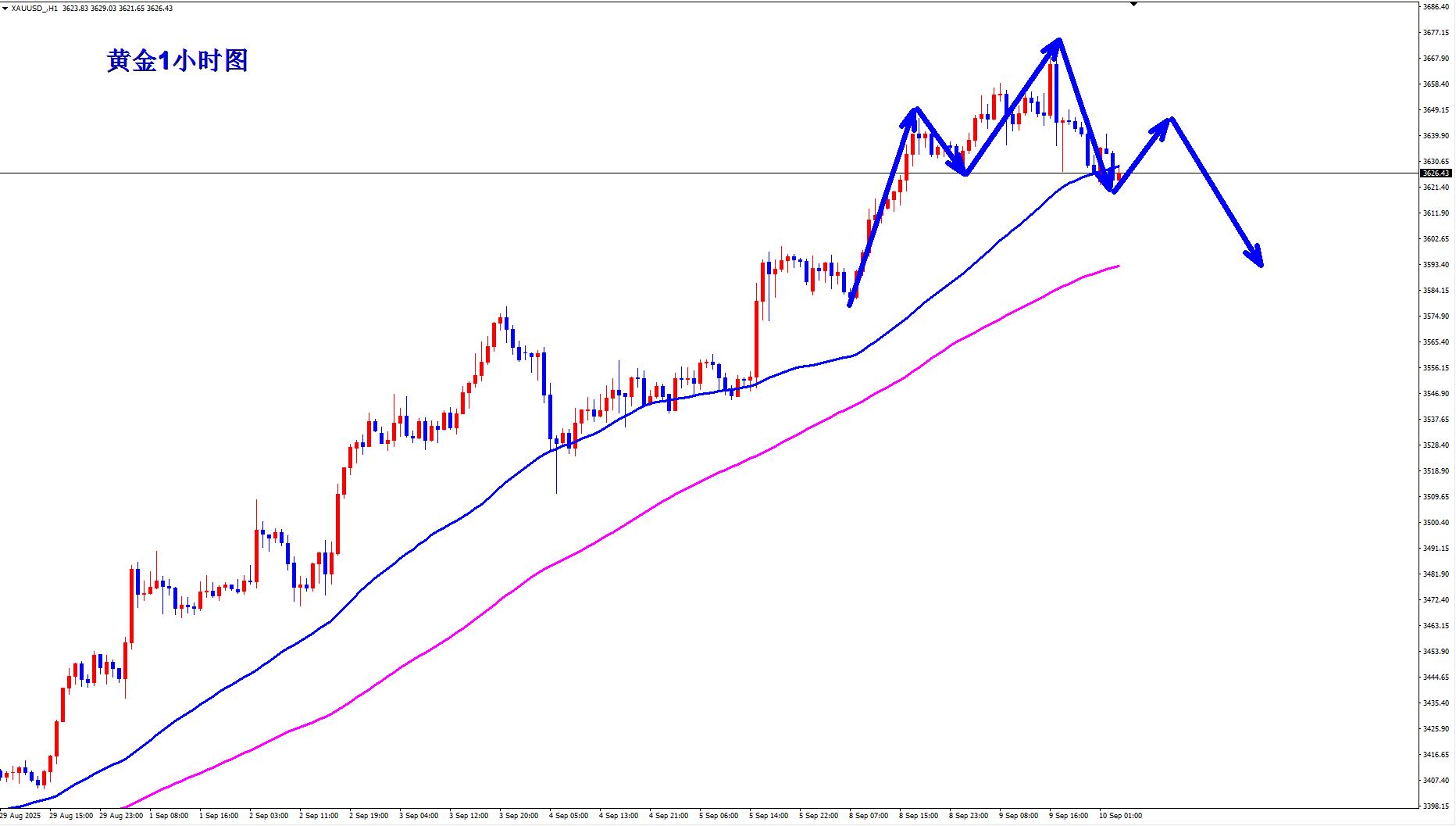 Gold has begun to form a short-term top structure in one hour. If the moving average of the 1-hour starts to turn down, then gold may start to adjust in one hour. We never act as a dead bull or a dead bear. Since gold has weakened in the short term, we should continue to be short first.