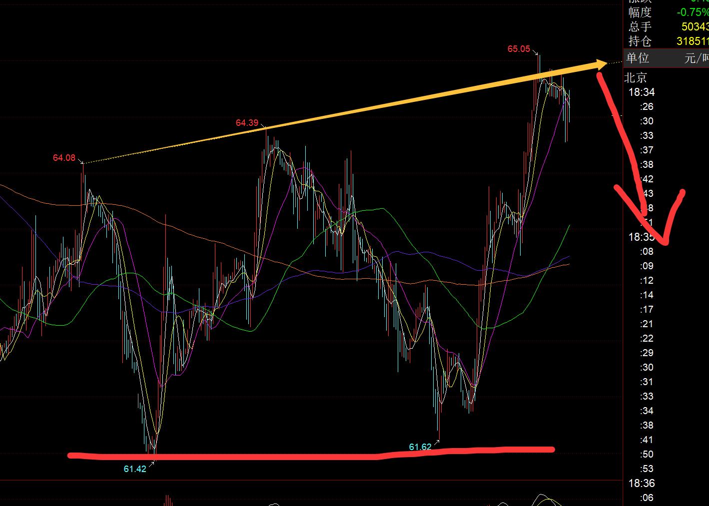 In terms of crude oil: the daily line is still in range consolidation. Judging from the above figure, the yellow trend resistance line is under pressure. The bearish decline is falling below 64.9 tonight, with support below 63.4 and 61.4;