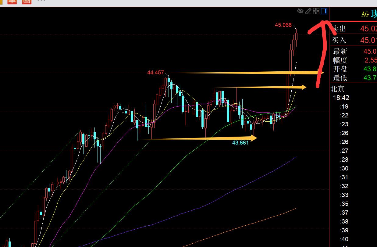 Second, in terms of silver: silver yesterday's trend was relatively resistant to decline, that is, it was to consolidate at a high range as scheduled, 4 3.6 support, 44.4 resistance, yesterday, relying on the high of 44.3-44.2, it repeatedly chose to fall bearishly and reach the target of 43.6;
