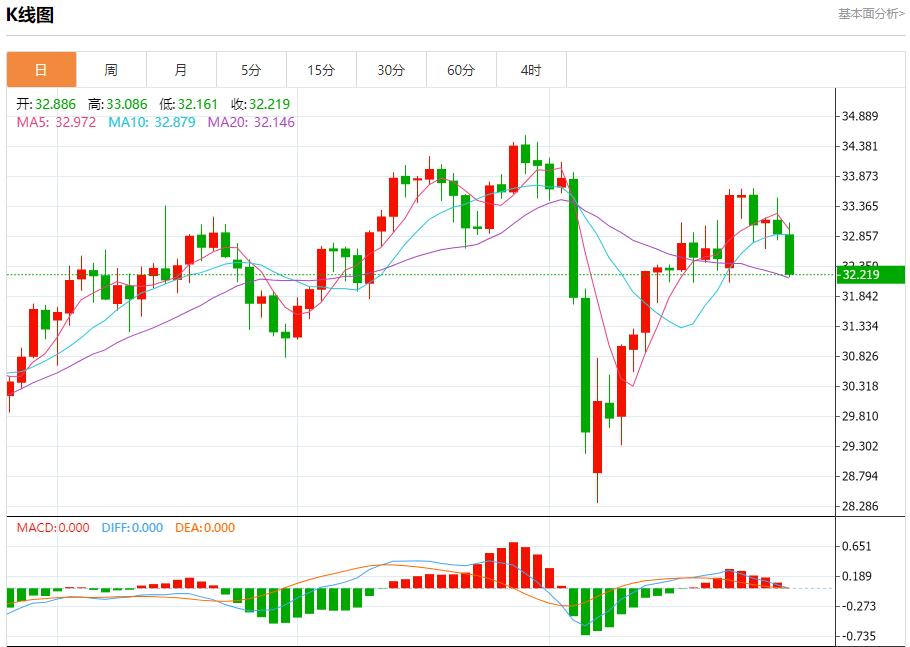 Spot Silver: a partir de 20:20 Tiempo de Beijing, Spot Silver Fell, ahora a 32.224, una caída de 2.09%. Antes de la Bolsa de Nueva York, los precios de la plata cayeron bruscamente en el último día de negociación, rompiendo el soporte clave de $ 32.70 y superando el apoyo de EMA50, que además de las señales negativas (RSI) también trajo presión negativa.