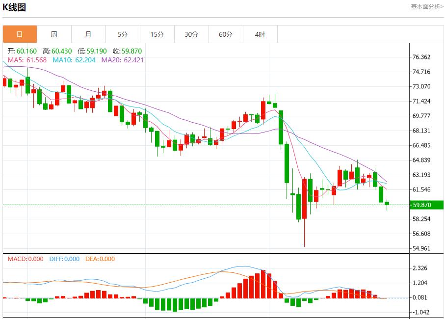 Mercado de petróleo crudo: a partir de 20:20 el tiempo de Beijing, el petróleo estadounidense cayó, ahora en 59.870, una caída de 0.94%. Antes de la Bolsa de Valores de Nueva York, los precios del crudo aumentaron el último día de negociación, tratando de recuperar pérdidas anteriores y deshacerse de la situación de sobrevendida obvia en (RSI), con una ola de mercado de oso afilado a corto plazoSegún el dominio.