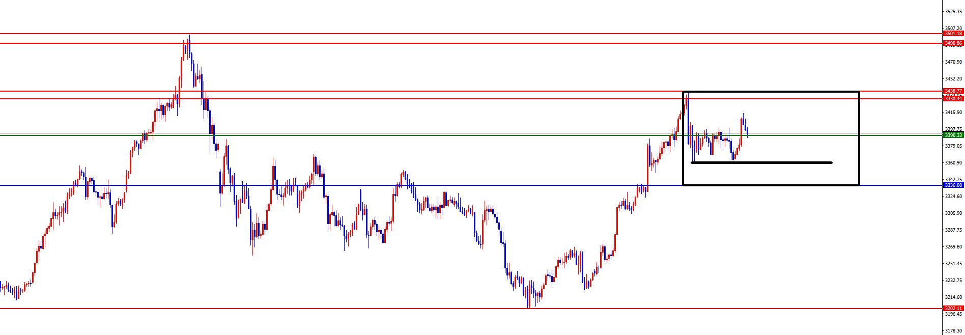 Gold está prestando atención temporalmente a las oscilaciones de rango 3337-3434.7, con las cuidias intermedias a 3389
