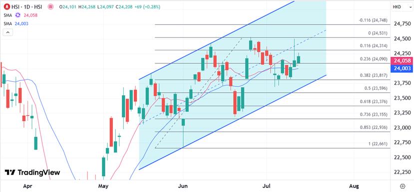 El índice Hang Seng probó el rango más alto de casi un mes el último día de negociación. Si no se abrió paso, desencadenó un retratamiento, no se rompió por encima de la pista media del canal ascendente y carecía temporalmente de un mayor impulso. Sin embargo, estaba por encima del promedio móvil principal de la tabla diaria, defendiendo la marca de 24,000 mientras conservaba el espacio para desafiar la resistencia por encima de 24,400 nuevamente.