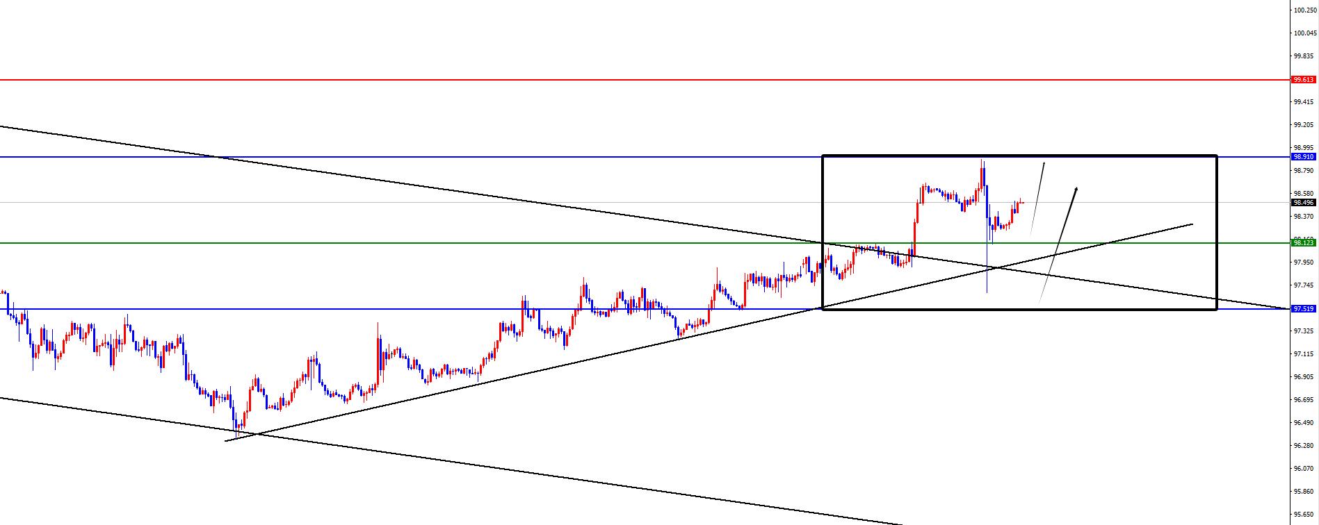 A partir de un análisis de múltiples ciclos, el precio se suprime en el área de resistencia 98.90, por lo que desde una perspectiva a mediano plazo, la tendencia del índice del dólar estadounidense será más bajista. A nivel diario, la posición clave de soporte de precios es de 97.50 a medida que pasa el tiempo. El precio se ha roto y se mantuvo firme. En el futuro, la banda por encima de esto se tratará con más frecuencia. En el período de cuatro horas, el precio reciente ha sido apoyado y aumentado después de tocar la línea del canal. Actualmente está aumentando. Con el paso del tiempo, el soporte actual de cuatro horas está en el rango de 98.20-30. El precio sigue siendo más tratado en esta posición. Mirando el precio actual, el precio continúa aumentando en una hora, y prestaremos atención al apoyo regional 98.10 en el futuro. Antes de que el precio se rompa en el rango 97.50-98.90, se tratará xm217.como un aumento volátil. Después del avance posterior al alza, prestará atención a una mayor aceleración.