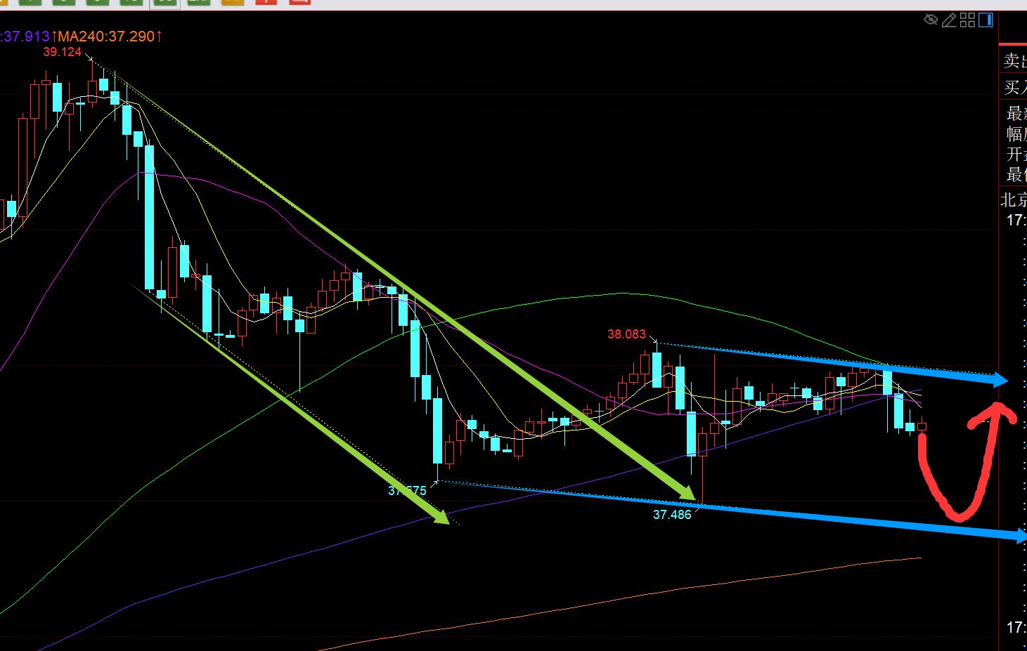 plateado: un buen canal básicamente corresponde a un buen soporte o resistencia; El canal operativo de hoy se centra en el área azul de la figura; the upper rail is 38 at one line of resistance, the lower rail is 37.4 at one line of support, and it will hit 37.4 first tonight and stabilize and bullish when it is low;
