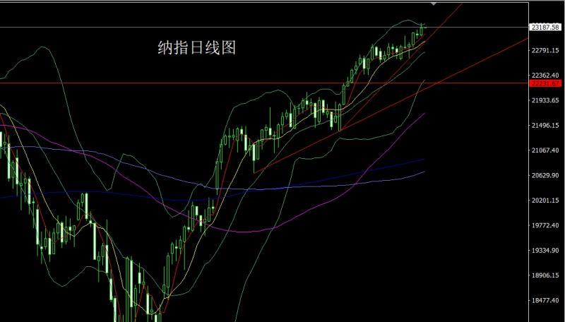 El mercado Nasdaq se abrió a 23062.58 ayer y el mercado cayó ligeramente. El mercado subió fuertemente. La línea diaria alcanzó el punto más alto de 23264.23. Después del mercado consolidado. La línea diaria finalmente se cerró en 23184.06. Luego, el mercado cerró con una línea media positiva con una larga línea de sombras altas. Después de que terminó este patrón, si la pérdida de parada 23100 se cae por primera vez hoy, el objetivo de 23100 es 23040.