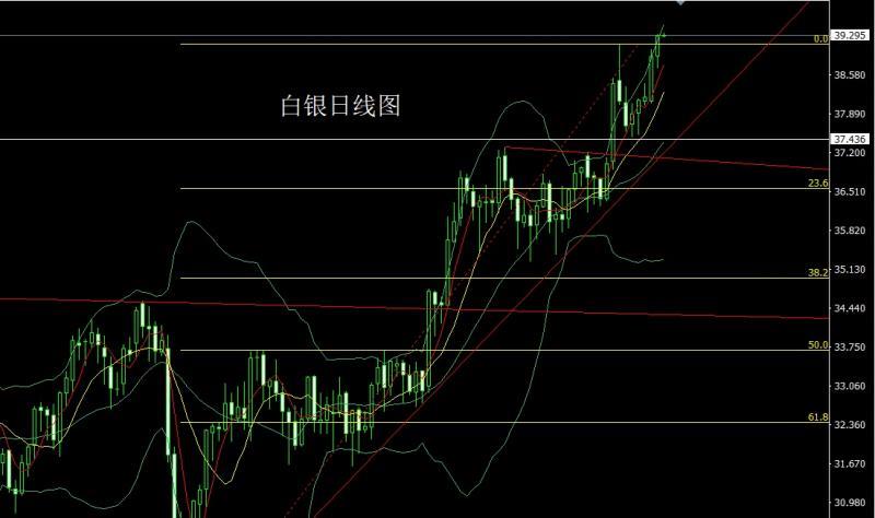 El mercado de plata abrió a 38.921 ayer y el mercado cayó primero. La línea diaria estaba en el punto más bajo de 38.7 y luego el mercado subió fuertemente. La línea diaria alcanzó el punto más alto de 39.307 y luego el mercado se consolidó. La línea diaria finalmente cerró a 39.278 y luego el mercado se cerró con una línea media positiva con una larga línea de sombras inferiores. Después de que terminó este patrón, la línea diaria rompió efectivamente la presión. En el punto, la línea diaria era más de 38.9. El objetivo era 39.3 y 39.5 y 39.65.