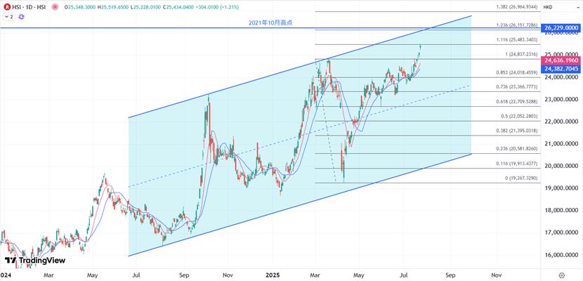 XM: las existencias de Hong Kong aumentaron durante tres días consecutivos y subieron 631 puntos en total. Después de continuar alcanzando un máximo de más de tres años y medio, el índice Hang Seng abrió 218 puntos más alto esta mañana. Llegó a otro máximo de más de 3 años y 8 meses, cerca del máximo de 25413 por la mañana en medio día, más de 283 puntos o 1.1%. Por la tarde, el mercado continuó haciendo esfuerzos bajo la fuerza impulsora de las acciones tecnológicas, rupiendo el máximo del mercado de la mañana, casi 400 puntos. Si el día se cierra por encima de 25,400, el próximo objetivo estará dirigido a la alta superación de octubre de 2021 por encima de 26,200.
