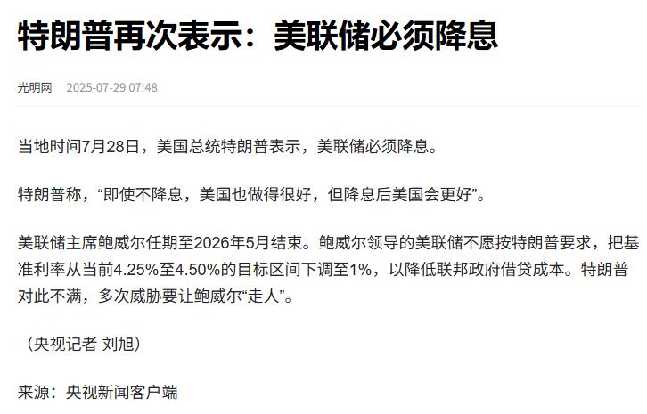 Después de la rara inspección de Trump de la Reserva Federal el jueves pasado, Trump declaró una vez más ayer que la Reserva Federal debe reducir las tasas de interés.