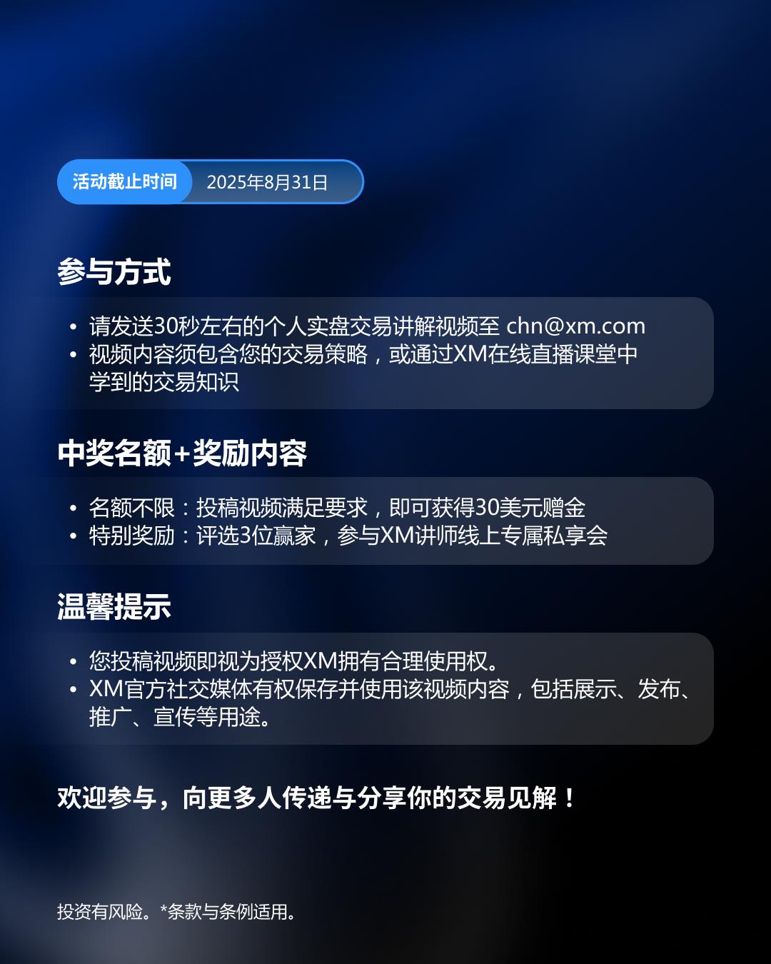 Ahora, desde el 31 de agosto de 2025 , envíe un video de explicación de transacción en tiempo real personal de aproximadamente 30 segundos a chn@xm.com para participar en la "actividad de intercambio de videos XM".