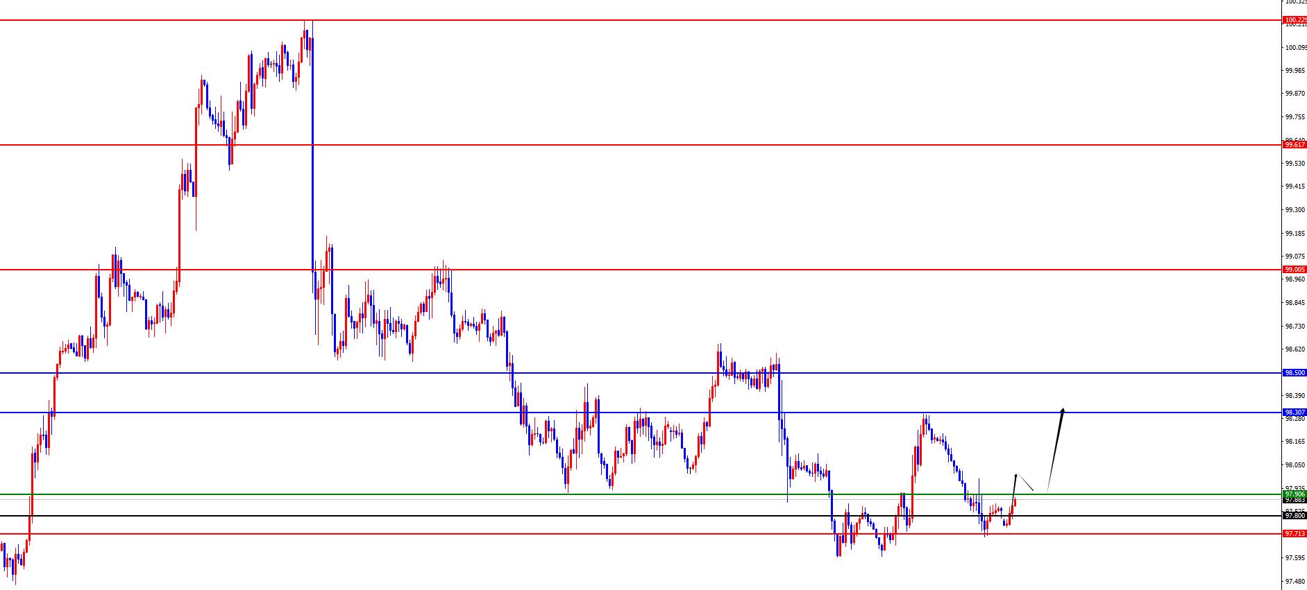 The US dollar index has a long range of 97.70-80, with a defense of 5 US dollars, and a target of 98.30-98.50