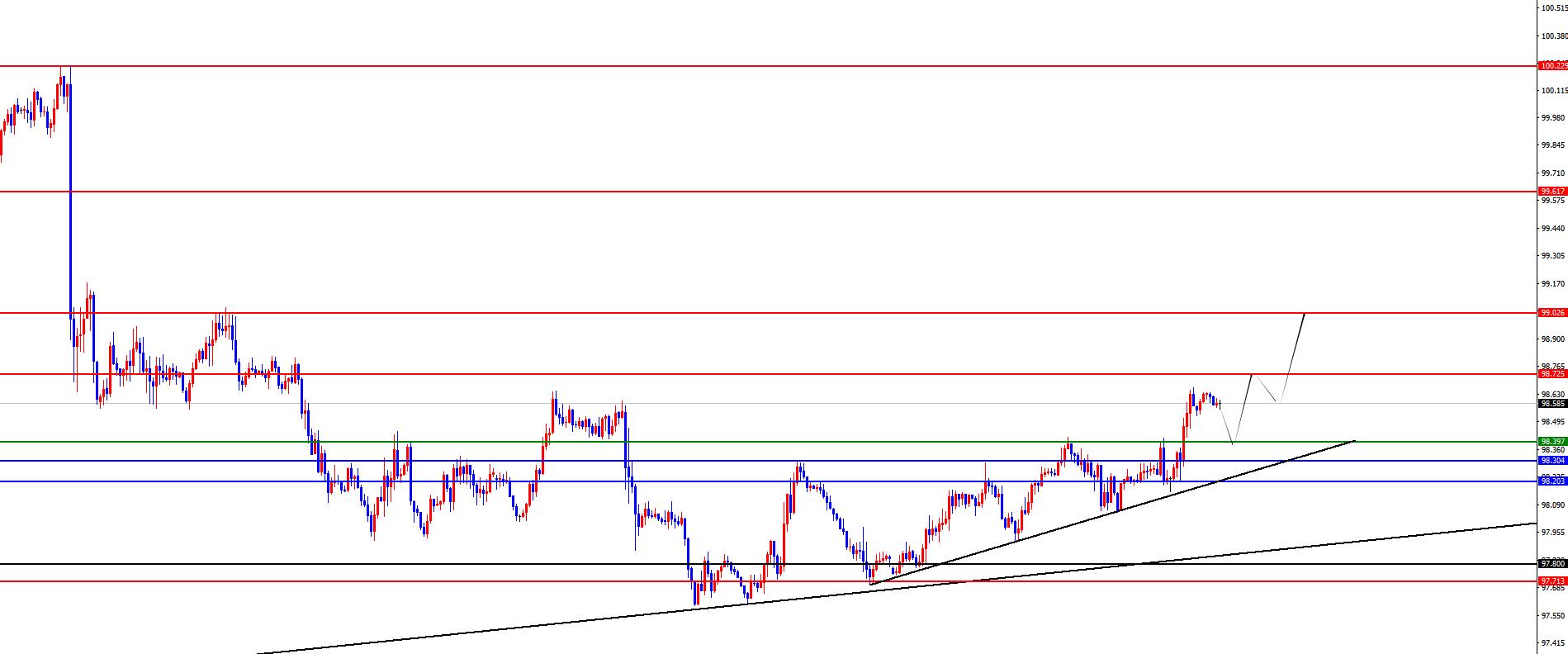 De un análisis de ciclo múltiple, el nivel semanal ha sido recientemente respaldado por el soporte semanal de arriba y hacia abajo. Esta semana, el enfoque está en la posición 98.30 para estabilizarse. Una vez que se mantenga firme, los toros a mediano plazo continuarán aumentando. A nivel diario, la semana pasada, el precio suprimió la posición de resistencia diaria y continuó fluctuando por debajo de la posición de resistencia diaria. La resistencia diaria actual es de 98.20. El precio se rompió al alza ayer y se mantuvo firme. En el futuro, prestaremos atención al mercado para que los toros se detengan en la banda. Desde la perspectiva de cuatro horas, la perspectiva de cuatro horas es la clave para nuestro énfasis en las tendencias de precios a corto plazo. Actualmente, el rango de soporte de cuatro horas es 98.30-40, por lo que, en general, puede continuar buscando hacia arriba en función de esta área. Desde una perspectiva de una hora, el precio de ayer aumentó xm217.como dijo el autor según la línea de tendencia y el apoyo de cuatro horas. Puede prestar atención a más y continuar en el futuro. El corto plazo anterior se centra en el área 98.70-99.