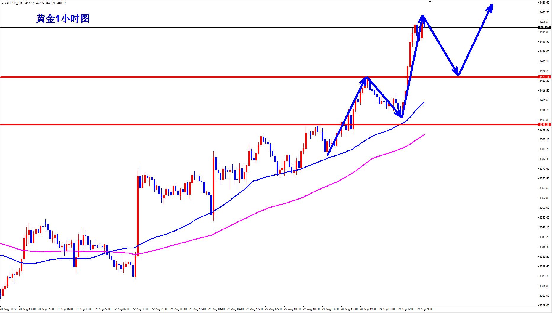 El oro es largo 3425, Stop Loss 3415, Target 3460-3470;