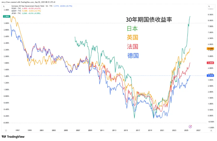 El rendimiento alemán de los bonos del Tesoro a 30 años aumentó a un rendimiento de 30 años en Francia a 30 años a su nivel más alto desde 2009, el rendimiento de Gran Bretaña para el mismo período alcanzó un máximo de 27 años, y Japón alcanzó un récord.