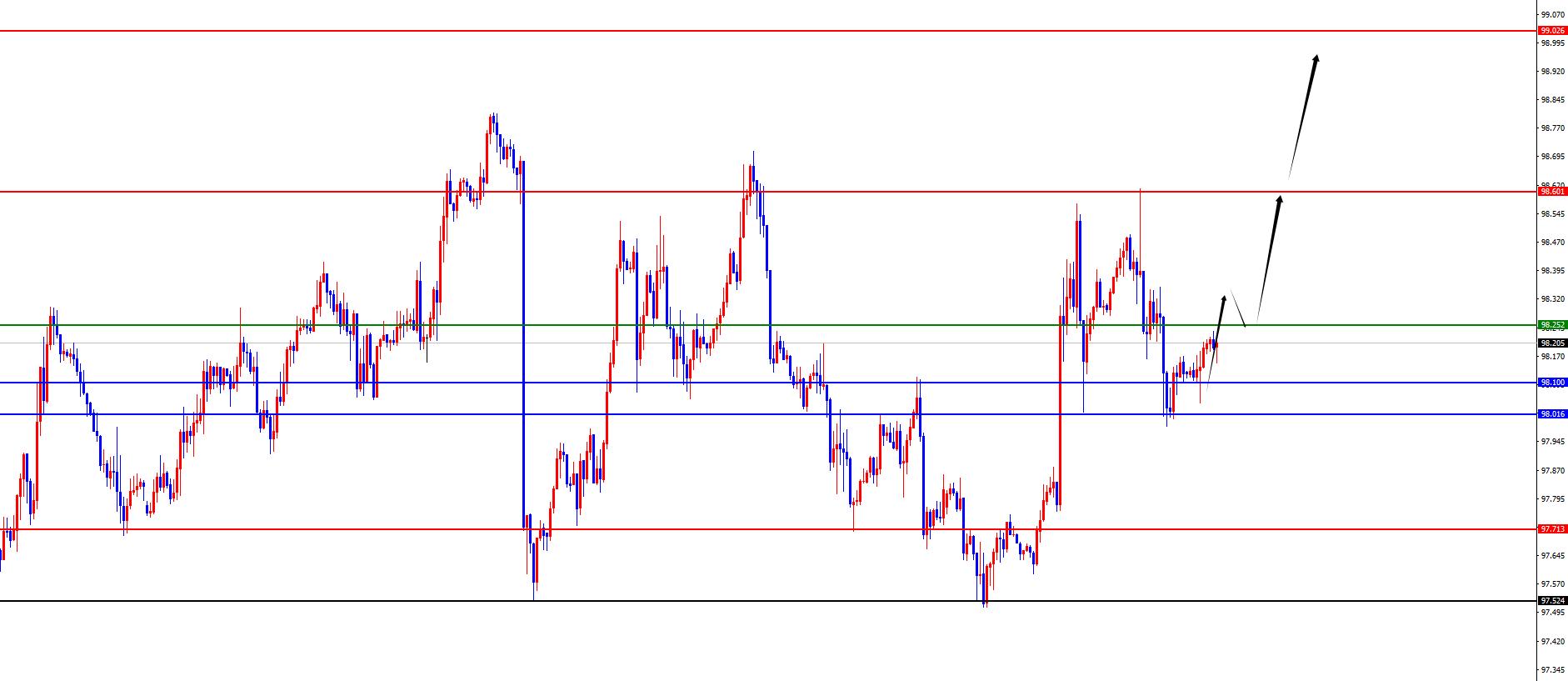 De un análisis de ciclo múltiple, el nivel semanal ha sido recientemente la consolidación clave de la línea semanal. Actualmente, la resistencia de la línea semanal se encuentra en el área 98, y el precio vuelve a romper el martes. Ayer, el precio continuó retrocediendo. En este punto, continúa tratando más según la oscilación y la línea a mediano plazo. Desde el nivel diario, debemos prestar atención al soporte regional 98.10 por el momento, por lo que siempre que el precio actual no se cierre, seguirá siendo más sesgado que el apoyo diario y semanal. Prestaremos temporalmente la atención al área 98.25 en cuatro horas, y continuaremos después de estar firmemente. También hay muchos en una hora ahora, y el enfoque anterior está en el área 98.60-99.