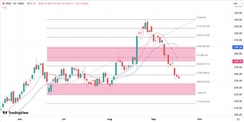 XM Hong Kong Stocks: Pop Mart (09992.hk) El precio de las acciones) ha caído recientemente, con una disminución acumulativa del 24% desde el final de agosto de agosto. Mostró su mayor caída desde abril del lunes, con una fuerte caída de casi el 9% en sesión, la mayor caída en cinco meses. El precio actual de las acciones ha alcanzado el más bajo desde principios de agosto, correspondiente a las expectativas de calificaciones de ingrato de las instituciones de calificaciones, lo que ha intensificado las preocupaciones de las personas sobre la disminución de la popularidad del producto de la xm217.compañía.