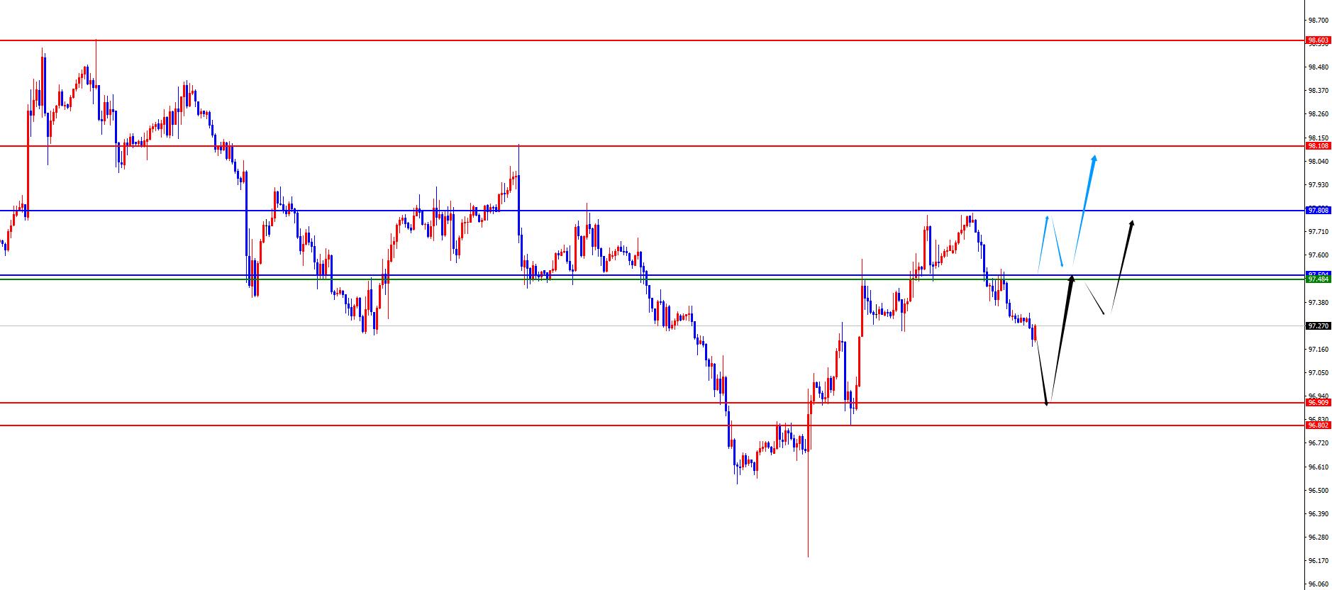 The US dollar index has a long range of 96.80-90, with a defense of 5 US dollars, and a target of 97.50-97.80-98.10