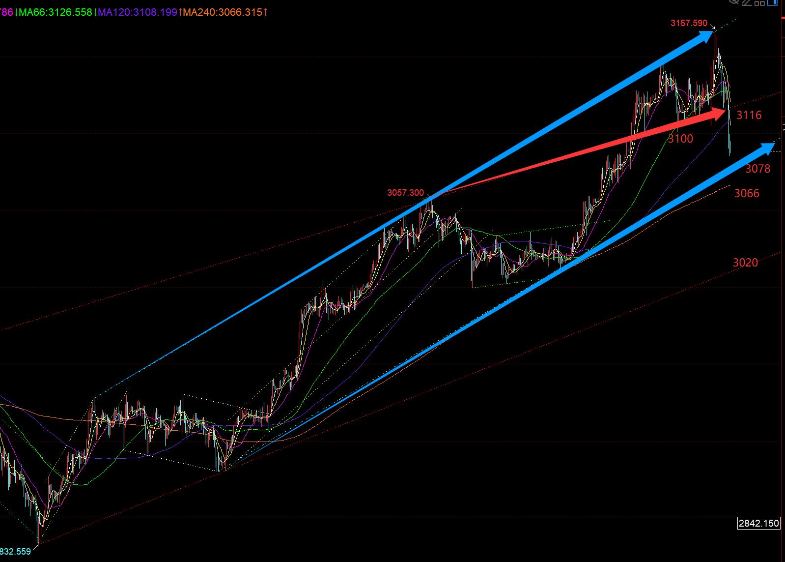A continuación, el rebote confirma que la presión de la línea roja es 3116, el soporte inferior del canal azul es 3078, y el promedio de móvil anual es 3066. Primero, presta la atención a la atención de los dos de apoyo a los dos de apoyo. Si hay un tirón repentino en los EE. UU. Antes y después del mercado estadounidense, puede continuar recurriendo dos veces; Si no rebotes y continúa cayendo en una respiración, entonces solo puede ser paciente. Espere la señal de estabilización;