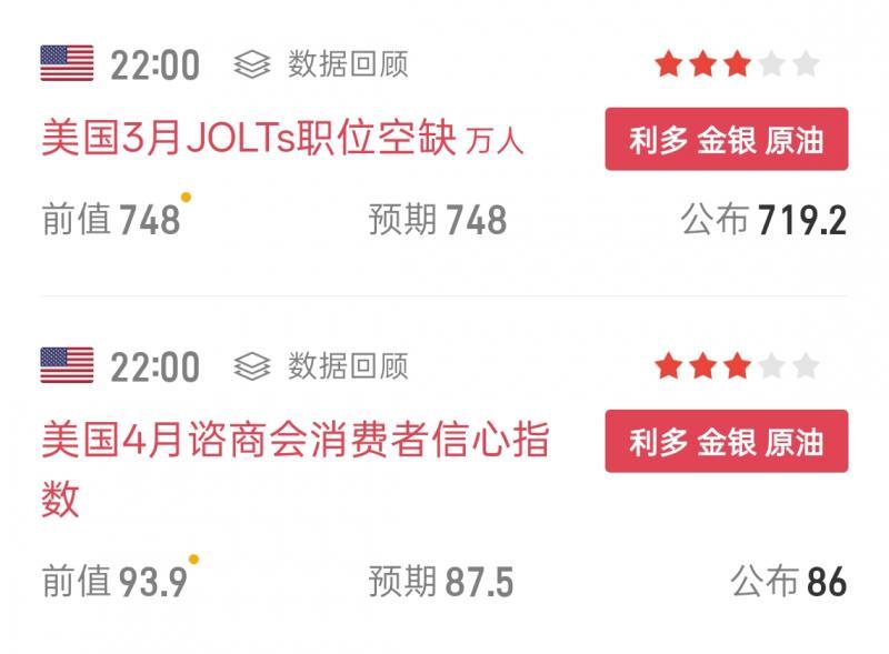 From the data perspective, yesterday it was announced that the number of job vacancies in the United States in March was lower than expected, the consumer confidence index was lower than expected and hit a new low in the past five years, which is directly related to tariffs, and such data also increased the probability du taux d'intérêt de la Réserve fédérale en juin.