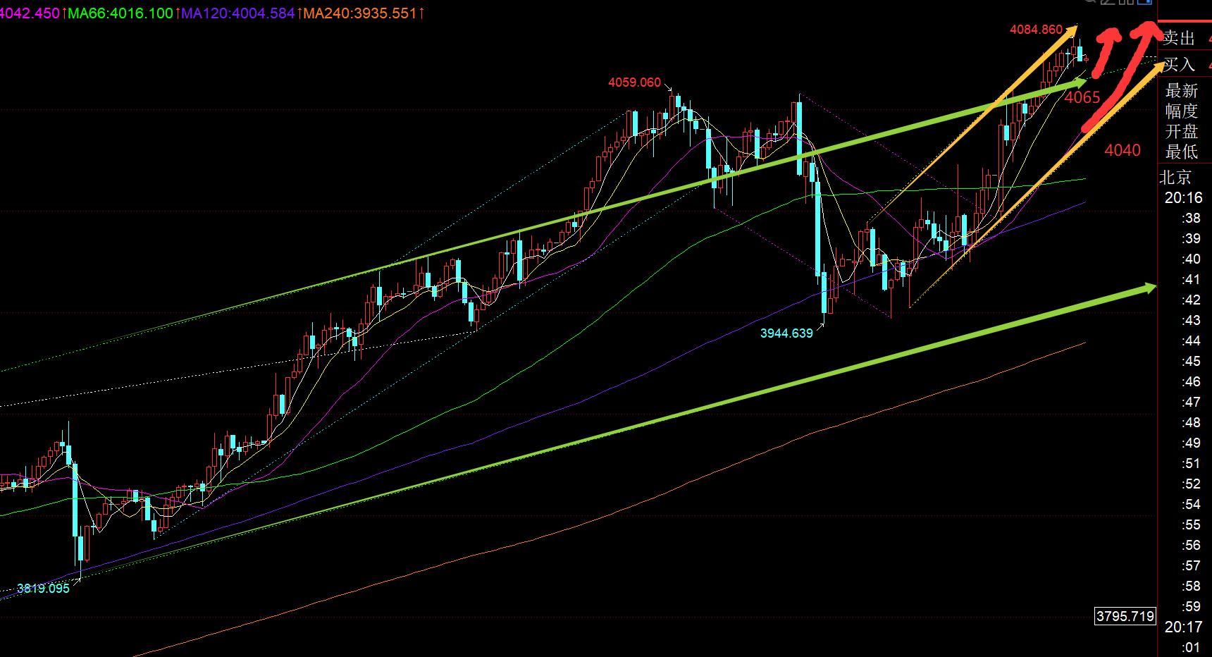 Troisièmement, le niveau de la ligne de l'heure d'or : tôt le matin, il est rapidement revenu sur 3995 puis a augmenté rapidement. Après avoir franchi 4010, il a clôturé à 4060, frappé par le soleil. Il a fallu une heure pour atteindre le but ; puis après la journée, il a continué à être haussier en reculant sur 4020, et après 10 heures, il a continué à être haussier en s'appuyant sur la moyenne mobile sur 5 jours de 4045, car il s'est appuyé sur la moyenne mobile sur 5 jours pour remonter. Ceci est un exemple typique. Un fort mouvement unilatéral intrajournalier ; par conséquent, la percée haussière de 4061 était également une embuscade à l'avance. La position 4060 a été sous pression à deux reprises la semaine dernière et a été supprimée à deux reprises ce matin. Il est facile de continuer à augmenter s'il y a une nouvelle percée, et finalement réussi à atteindre l'objectif, s'approchant de l'objectif de 4080 ; puis après avoir franchi 4060, il y aura une vague de hausse, et le retracement confirme qu'il s'agit de la position supérieure et inférieure. 4060 est à nouveau une opportunité haussière, et le marché européen atteint à nouveau l'objectif de 40 80 ; ce soir, les marchés asiatiques et européens ont augmenté jusqu'au bout, et le marché américain a reculé pour une vague et a connu une deuxième hausse, mais nous devons être prudents, car aujourd'hui, il a augmenté de 90 mètres du plus bas au plus haut, ce qui est la limite de 100 mètres pour la journée, alors essayez de ne pas courir après la hausse, revenez au premier support et concentrez-vous sur la ligne 4065. Sur la figure, la piste supérieure du canal vert au début confirme une fois de plus le niveau de support, suivie de la piste médiane, qui est également proche du canal jaune. Sur la piste inférieure de 4040, j'espère reculer davantage pour laisser place à une autre hausse dans la journée ; sinon, le niveau élevé continuera de s'échanger fortement latéralement et continuera d'augmenter demain ; l'objectif de résistance sera 4 090-4 100, ce qui est la position extrême aujourd'hui ; rappelez-vous, le principe d'être seulement long mais pas court, ne regardez pas facilement la baisse, chaque jour sera témoin de mouvements extrêmes rares dans l'histoire ;