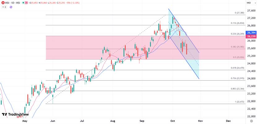 L'indice Hang Seng a clôturé à 25 473 à midi, en baisse de 415 points, et a continué à atteindre son plus bas en début d'après-midi ; l'indice H-Share a chuté de 185 points, ou 2 %, à 9 074 points ; le KLCI a chuté de 188 points, soit 3,14%, à 5 814 points.