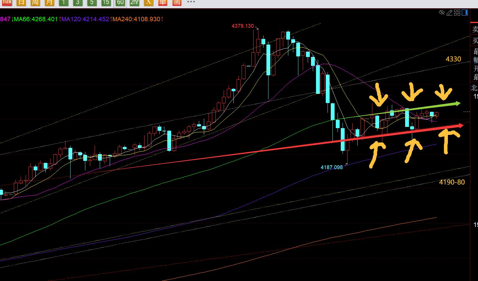 Troisièmement, le niveau horaire doré : de manière générale, après une forte baisse pendant la nuit, le lendemain, vous rechercherez des sommets de rebond tôt le matin ou divisés niveaux de résistance, ou mid-rail, big Yin et autres résistances pour essayer de poursuivre la baisse, surtout si vous tirez brusquement à l'ouverture de la matinée, c'est très facile Cela n'a pas continué et est retombé ; il a augmenté tôt et est retombé à la ligne 4273,5 sous pression. La pression 4277 mentionnée dans la vidéo de Zhou était légèrement pire. Il est tombé à 4218 pour la première fois et a rebondi avant de tester la ligne 4270. 4218 se trouvait être le support de division 618 ; il était sous pression à 42 heures de l'après-midi. 70 a également supprimé une vague proche de la trajectoire médiane, est tombé à 4 221, puis s'est stabilisé et a rebondi à 4 265 ; le prix va et vient, apparemment chaotique, mais en fait il peut suivre un arrangement triangulaire convergent, avec les points hauts se déplaçant progressivement vers le bas et les points bas augmentant progressivement lentement, ce qui peut également être considéré xm217.comme un arrangement de canal parallèle, la résistance de la crête Feng Shui est de 4274, le support de la crête Feng Shui est d'environ 4220, fonctionnant dans une plage de 50 mètres ; de plus, ce genre de marché ascendant et descendant rapide à court terme, si vous hésitez un instant, soit vous ne pourrez pas entrer dans les points hauts et bas relativement bons, soit vous serez avide lorsque vous réaliserez des bénéfices, vous reviendrez donc à votre position d'origine, ou vous le ferez afin de vous protéger, de descendre et de vous défendre avant d'atteindre votre espace cible d'origine ; par conséquent, vous ne pouvez fermer que lorsque c'est bon, mais à la fin, cela brisera définitivement l'équilibre et ira dans une direction pour percer ou élargir la plage de choc. Vous devez faire attention à la ligne de résistance moyenne mobile sur 66 jours 4268 et au point haut de la plaque asiatique 4274. Si ces deux résistances sont cassées à la hausse, et que c'est après la percée continue du Yang ou la percée du Dayang de 66 jours, alors vous pouvez envisager de prendre du recul pour suivre la tendance haussière. Vous pouvez au moins créer une vague de sous-hauts, voir 618 divisant la résistance 4305, ou même en dessous du point de contre-pression dérivé du canal précédent 4330 ; au contraire, s'il n'y a pas de cassure de ces deux niveaux de résistance, il peut y avoir une vague de pression à la baisse, en particulier la ligne de tendance rouge dans le graphique de cassure effective correspond au support actuel de 4240. Cela nécessite également des conditions négatives continues ou totalement négatives pour être efficace. Vous pourrez alors tester la fourchette du plus bas de vendredi dernier de 4190-4185. Regardez ses gains et ses pertes ; bien sûr, tant qu'il ose baisser davantage, le macd s'éloignera du bas, et lorsqu'il se stabilisera, il y aura un point haussier bas de gamme relativement bon dans les perspectives du marché ; la tendance à la hausse ne changera pas, et les ajustements et corrections à la baisse sont tous des préparatifs pour que les perspectives du marché atteignent de nouveaux sommets historiques ;