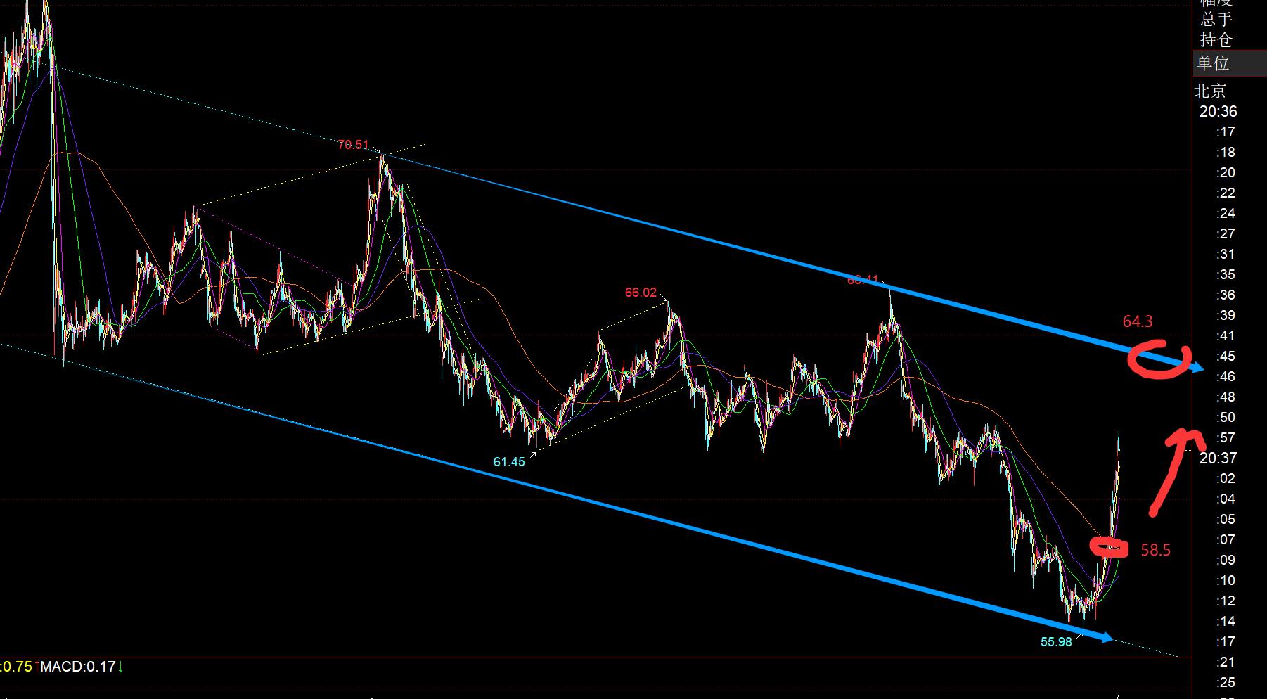Pétrole brut : en raison des sanctions des deux derniers jours, les prix du pétrole ont augmenté à court terme. Lorsqu'il dépasse la moyenne mobile annuelle horaire, cela signifie qu'il y aura une dynamique ascendante continue ; à partir du canal dans le graphique, il est toujours à la baisse, avec la piste supérieure de 64,3. Aujourd'hui, les marchés asiatiques et européens continuent de progresser. L'action de retracement avant et après le marché américain peut être haussière pour la deuxième fois. Faites attention à trouver une position au-dessus de 58,5 pour vous stabiliser et voir un rebond ;