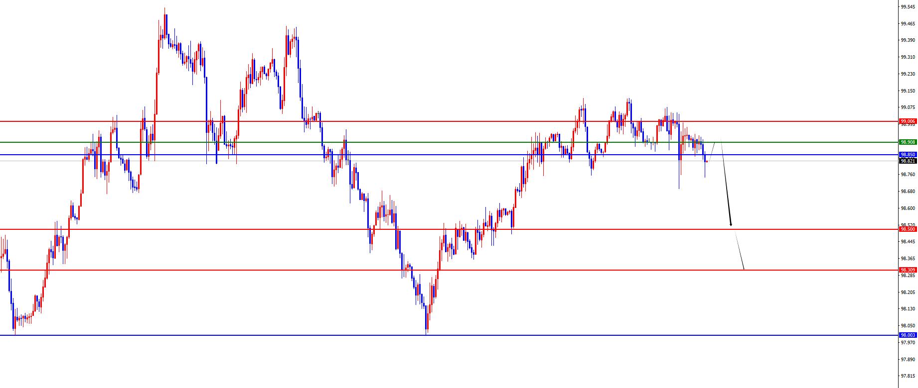 L'indice américain est court dans la fourchette de 98,90 à 99, défendant 5 dollars américains et visant 98,50 à 98,30