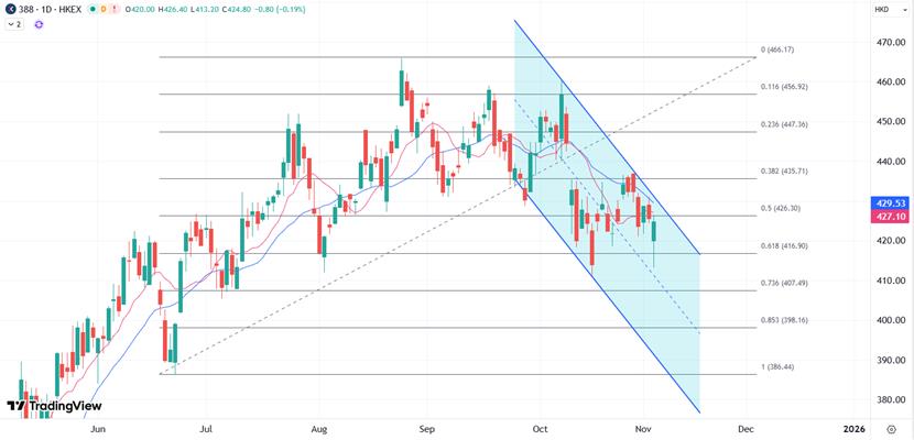 Du point de vue de la valorisation, le P/E actuel de la Bourse de Hong Kong est d'environ 30 à 35 fois. Bien qu’il soit proche d’un sommet sur un an, il est également supérieur à la moyenne historique (environ 25 à 30 fois), mais inférieur à celui des entreprises technologiques à forte croissance. Des bénéfices supérieurs aux attentes ont peut-être fait grimper le cours des actions récemment, mais le caractère trop élevé des valorisations dépend de la durabilité de la croissance future. Les valorisations actuelles intègrent en partie un volume de transactions record, mais ne reflètent pas pleinement le potentiel à long terme des introductions en bourse et des produits dérivés. Après la performance d’aujourd’hui, le cours de l’action a suivi le marché et a été affecté. Cependant, à court terme, le cours de l'action continuera de digérer les performances positives, mais s'il parvient à franchir la résistance de la moyenne mobile quotidienne et à revenir au haut de la fourchette depuis la mi-octobre, la résistance clé pour revenir à la fourchette haute est de 440 HK$.