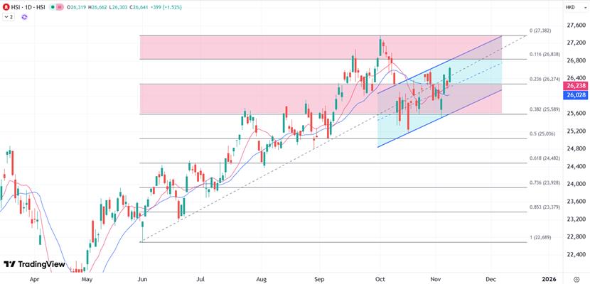 L'indice Hang Seng a franchi le précédent canal baissier après avoir clôturé en hausse la semaine dernière. Il tente actuellement d’élargir le canal ascendant. Le niveau de rupture clé se situe à 27 000 et la résistance la plus élevée se situe au plus haut de 27 380 début octobre. Avant l'annonce des résultats des géants de la technologie, cela pourrait limiter son élan pour franchir la barre importante. Par conséquent, faites attention à savoir s’il se consolidera à un sommet d’un mois. Il est essentiel de maintenir le support des moyennes mobiles dans le canal, en particulier la barre des 26 000 où se situe la moyenne mobile sur 20 jours.