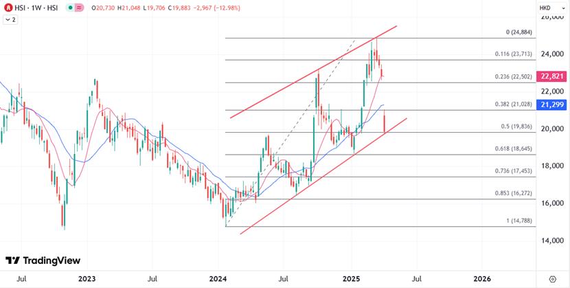 Dans une perspective à plus long terme, l'imposition du tarif xm217.complet de Trump endommagera l'économie américaine, et il sera également négatif pour les perspectives du dollar américain, augmentant la pression sur les fonds pour sortir du marché américain. D'un autre côté, le marché boursier de Hong Kong est favorisé par les fonds depuis l'année, de sorte que certains fonds pourraient continuer à investir dans des actions de Hong Kong, mais à court terme, le sentiment du marché continuera d'être occupé par l'impact négatif de la guerre tarifaire. Les actions de Hong Kong ne peuvent pas éviter les fluctuations à court terme. À l'heure actuelle, le support de la ligne de tendance clé dans le graphique hebdomadaire est la clé pour déterminer si la pression à court terme est atténuée.