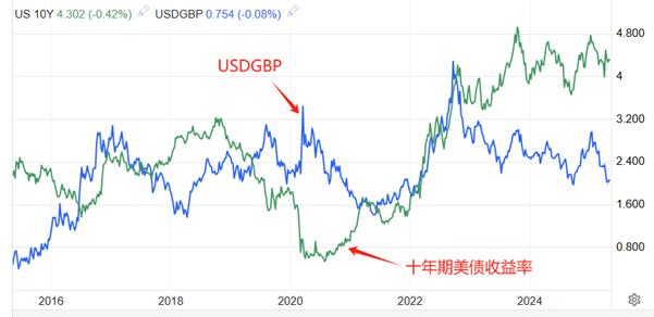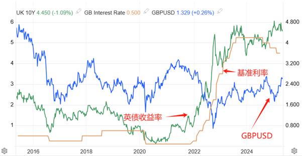 Il grafico sopra è una sovrapposizione del tasso di tendenza giornaliero della banca dell'Inghilterra, il tasso di interesse di riferimento del Regno Unito, il Regno Unito del Treasury e GBPUSD. Il tasso di interesse di riferimento della Banca d'Inghilterra e il rendimento del Tesoro a 10 anni del Regno Unito mostrano una risonanza significativa in un lungo ciclo, ma a medio ea breve termine, i due occasionalmente divergenti. Ad esempio, dal settembre 2024, la Banca d'Inghilterra ha mantenuto una tendenza dei tagli ai tassi di interesse, ma il rendimento obbligazionario britannico a 10 anni ha continuato ad aumentare. La tendenza di GBPUSD ha anche caratteristiche di risonanza con il rendimento obbligazionario britannico a 10 anni, ma questa risonanza sarà danneggiata in qualche momento. Ad esempio, dall'agosto 2021 a settembre 2022, il rendimento delle obbligazioni britanniche di dieci anni continuò a salire, mentre GBPUSD continuò a cadere e i due si discostavano significativamente.