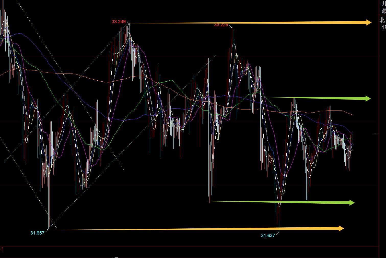 Silver: densely repeated sorting, no rules to follow, parallel channels are difficult to find, just the interval continues to oscillare; Grande intervallo 31.65-33.25, piccolo intervallo 32.65-31.85;