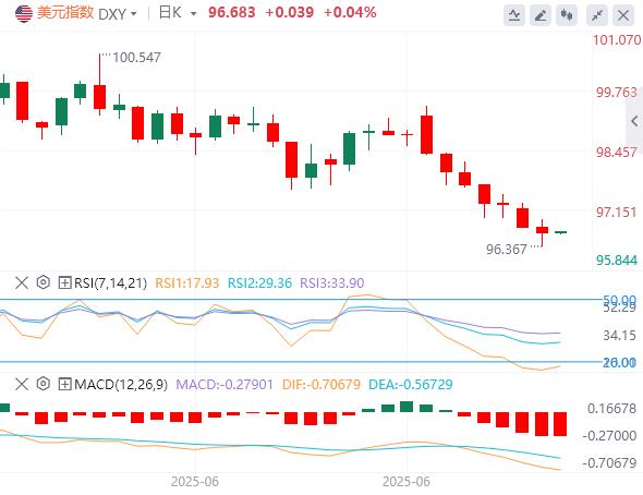 Indice in dollari: al momento della stampa, l'indice del dollaro USA si aggira intorno a 96,68. Alla fine del secondo trimestre del 2025, le prestazioni xm217.complessive del dollaro USA hanno continuato a indebolirsi. Il Wall Street Journal ha sottolineato che il dollaro USA è diminuito di oltre il 5% dall'inizio di aprile e, secondo alcune statistiche analitiche, il declino cumulativo dell'indice del dollaro USA contro un paniere di valute principali ha raggiunto circa il 12% da metà febbraio. All'inizio del terzo trimestre, questa tendenza è proseguita, con un forte sentimento ribassista del mercato e il modello debole del dollaro USA è stato inizialmente istituito. Tecnicamente, l'indice del dollaro USA è attualmente in bilico circa 96,85 eIl minimo intraday di 96,38 rimbalzava e ritestò il limite inferiore del cuneo, ma è ancora ben al di sotto della media mobile esponenziale di 21 giorni (EMA) ed è attualmente a 98,20. Questo continuo rifiuto dell'EMA evidenzia l'intensità dell'attuale tendenza verso il basso. La rottura sotto il cuneo indica che la pressione ribassista può accelerare senza alcun segno di inversione immediata.