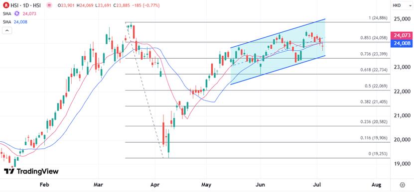 Hong Kong Stocks bloccato nei primi calo della prima settimana di luglio. Ieri, lo slancio dell'acquisto di Beishui per 25 giorni è stato interrotto e le azioni tecnologiche sono diventate l'obiettivo principale del contanti. Le azioni tecnologiche hanno cercato di rimbalzare durante la giornata, ma le grandi scorte tecnologiche erano un po 'deboli, quindi l'indice Hang Seng ha sostenuto il segno di 24.000 marchi e ha bisogno di una stimolazione positiva dalle notizie per sbarazzarsi del modello di consolidamento. L'aspetto tecnico è attualmente in bilico vicino alla pista centrale del canale verso l'alto ed è anche al di sotto della media mobile giornaliera. Se il giorno si chiude al di sotto di questo livello, potrebbe continuare a essere debolmente consolidato lunedì.