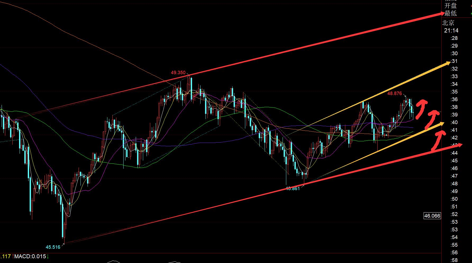 Argento: dall'immagine sopra, si trova anche nel canale ascendente del canale rosso, mentre il canale piccolo si trova nel canale giallo verso l'alto. L'attuale supporto orario mid-rail è 48,35 e il supporto frazionato intraday 618 è 48,3. Innanzitutto, presta attenzione alla stabilizzazione del supporto; mentre il supporto ferroviario inferiore del canale giallo è 48. In questa posizione è presente anche un rimbalzo stabilizzante. Se è più debole, sarà il supporto del binario inferiore del canale rosso 47.6; pertanto, in caso di shock, stasera prestate attenzione ai segnali di supporto e stabilizzazione di questi tre luoghi. Se provi il fondo e tiri su K o Dayang K, puoi provare ad intervenire e testare se fai un passo indietro nell'ora successiva. La resistenza è 48,85 e 49,4;