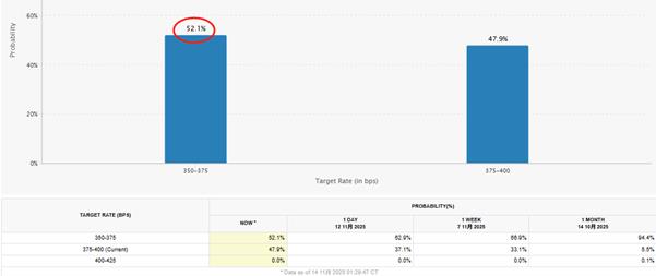 Secondo i dati CME FedWatch, la probabilità che la Federal Reserve tagli i tassi di interesse di 25 punti base a dicembre è del 52,1% e la probabilità di lasciarli invariati è del 41,9%. Rispetto alla probabilità di oltre il 70% di un taglio dei tassi di interesse della scorsa settimana, la probabilità dell'ultimo taglio dei tassi di interesse è notevolmente diminuita. Originariamente, l’aumento dell’oro e dell’argento è stato guidato dall’aumento della probabilità di tagli dei tassi di interesse. Ora che la probabilità di tagli dei tassi di interesse è diminuita, l’aumento dell’oro e dell’argento potrebbe incontrare una forte resistenza.