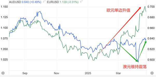 L'immagine sopra è la sovrapposizione giornaliera di Audusd ed Eurusd. Già il 10 gennaio di quest'anno, Eurusd si era ridotto e rimbalzato, con i prezzi che salivano dal più basso 1,0240 al più alto di questa settimana di 1,1520, con un aumento di 1.280 punti. Al contrario, AUDUSD, nello stesso periodo, il prezzo è salito da 0,614 all'attuale 0,639, con una volatilità di soli 25 punti base e una significativa oscillazione. Anche due settimane fa, AUDUSD ha raggiunto un minimo di 0,596. Di fronte al continuo declino dell'indice del dollaro USA, il dollaro australiano non solo non ha apprezzato, ma deprezzato da 45 punti base.