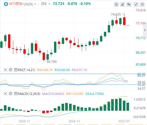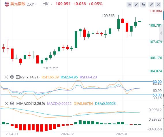 1月9日,北京时间周四亚市早盘,美元指数徘徊在109.05附近。周三,因外媒称特朗普正考虑宣布全国经济紧急状态,以便征收大量普遍关税,全球债券继续被抛售,美元指数得到提振,最终收涨0.29%,报108.99。基准的10年期美债收益率收报4.7060%;对货币政策更敏感的两年期美债收益率收报4.2970%。因美国12月“小非农”不及预期,现货黄金延续涨势,最终收涨0.49%,报2661.72美元/盎司。现货白银最终收涨0.17%,报30.11美元/盎司。WTI原油冲高回落,在触及74.64美元后跌势不止,最终收跌1.49%,报73.25美元/桶;布伦特原油收跌1.29%,报76.13美元/桶。