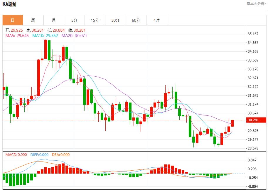 现货白银:截止北京时间21:15,现货白银上涨,现报30.271,涨幅1.19%。纽市盘前,白银价格显示出额外的看涨倾向,以加强对今天继续看涨趋势的预期,提醒您我们主要等待的目标位于30.63美元,受下方支撑价格的EMA50上方的支撑,提醒您看涨趋势的持续取决于29.63美元上方的价格稳定性。