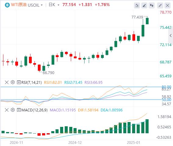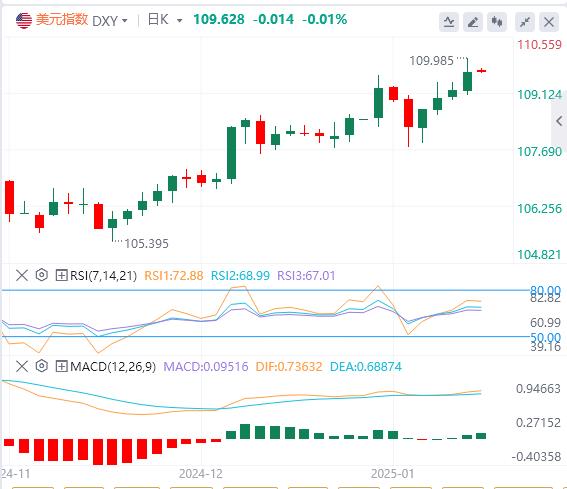 1月13日,北京时间周一亚市早盘,美元指数徘徊在109.62附近。上周五,因强劲非农强化了美联储将在本月晚些时候的政策会议上暂停降息的预期,美元指数连续第四个交易日收涨,同时也是连续第六周收涨,最终收涨0.43%,报109.64。美债收益率也大幅上升,基准的10年期美债收益率收报4.769%;对货币政策更敏感的两年期美债收益率收报4.388%。即使强于预期的美国就业数据强化了美联储今年可能不会大刀阔斧降息的预期,但市场对特朗普新政府政策的不确定性以及中东地缘政治再度复杂化似乎提升了黄金的避险吸引力。现货黄金剧烈震荡,盘中一度跌破2670关口,而后强势收复全部失地,并一度逼近2700美元关口,最终收涨0.75%,报2689.88美元/盎司。现货白银最终收涨0.94%,报30.38美元/盎司。受寒冷天气影响以及交易员关注美国对俄罗斯实施更多制裁可能造成的供应中断。WTI原油盘中一度大涨4%,但在尾盘回吐部分涨幅,最终收涨2.87%,报75.82美元/桶;布伦特原油盘中一度站上80美元关口上方,但未能站稳此处,最终收涨2.92%,报79.19美元/桶。