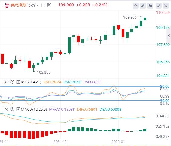上周五强劲的非农数据强化了美联储在三月会议前(包含三月会议)不降息的预期,美指连涨四日并实现周线级别的六连阳,截至目前,美元报价109.90。