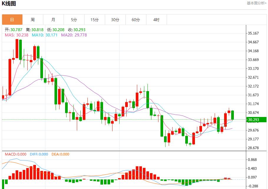现货白银:截止北京时间21:26,现货白银下跌,现报30.297,跌幅1.60%。纽市盘前,白银价格下跌至关键支撑30.63美元,这促使人们在即将到来的交易中保持谨慎,因为价格需要保持在这一水平以上,以保持今天的积极局面,其下一个目标位于31.63美元,提醒你打破上述支撑将推动价格遭受日内损失,并主要访问29.63美元。