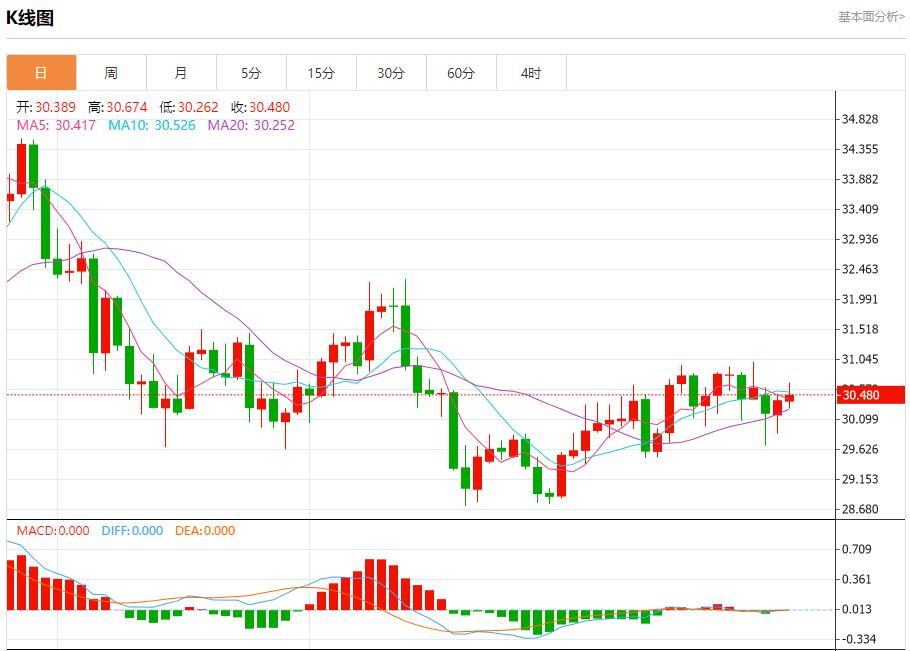 现货白银:截止北京时间21:26,现货白银上涨,现报30.495,涨幅0.20%。纽市盘前,白银价格在看涨通道的破碎支撑附近徘徊,注意到随机指标现在显示出负面信号,等待激发价格恢复今天预期的看跌趋势,目标测试29.63美元作为下一个主站,提醒您突破30.63美元将停止看跌波,并导致价格转向上涨。