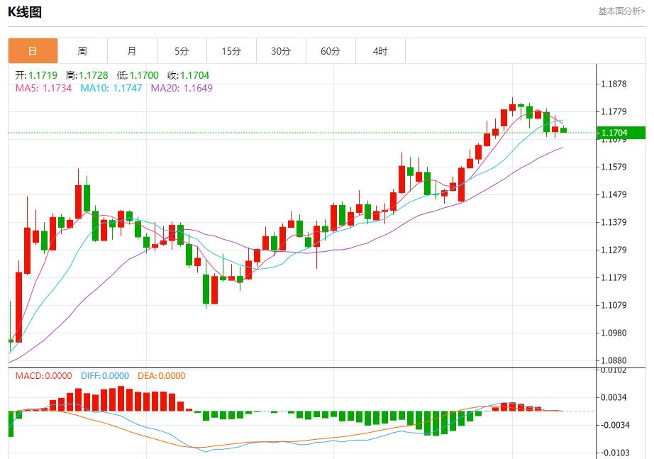 欧元/美元:截止北京时间19:16,欧元/美元下跌,现报1.1704,跌幅0.18%。纽市盘前,欧元兑美元在最后一个盘中交易中小幅下跌,短期看跌修正趋势主导地位继续,价格由于交易低于EMA50而面临明显的负面压力,表明目前看涨势头。