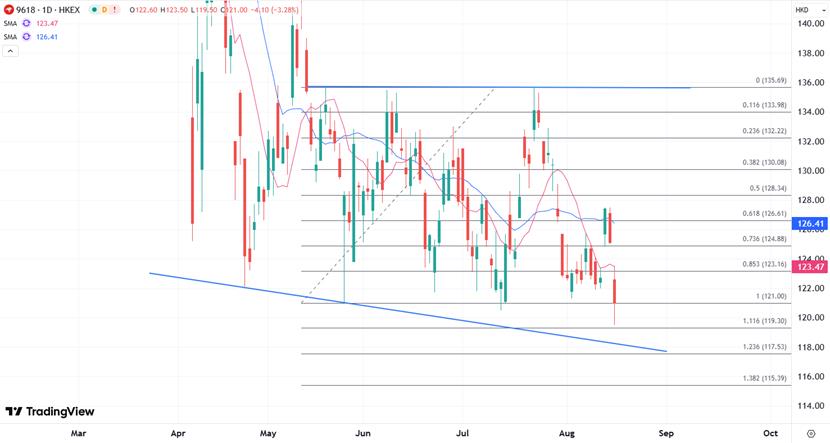 京东股价在绩后直接低开低走,除了最新业绩拖累外,部分跟随大市的下行压力,股价一度创下去年9月以来的最低,技术上10日均线成了盘中高位,留意120港元下方成为目标,如果跌破意味着更多的卖盘可能跟进,但留意低位趋势线可以提供部分支撑。