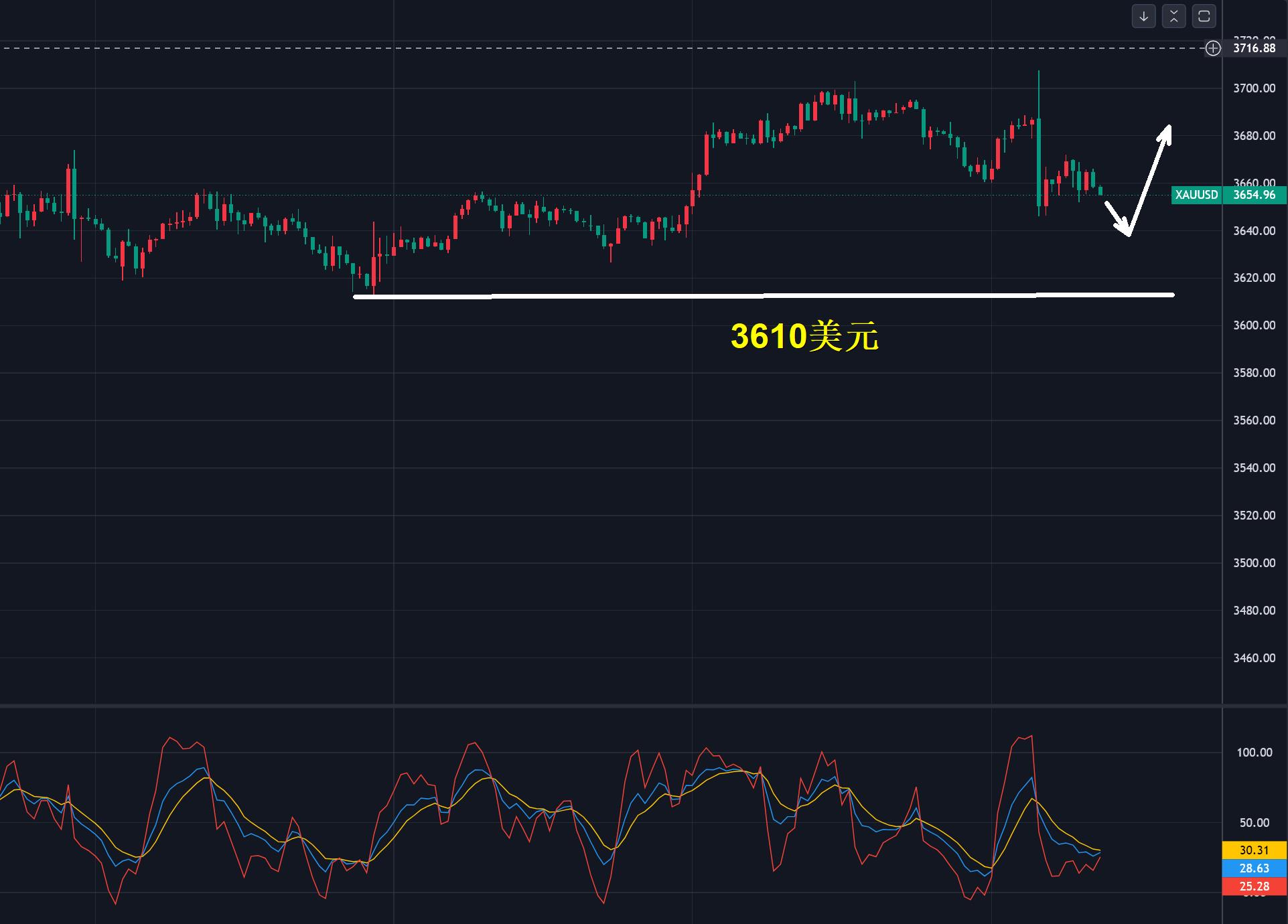 今天,我的观点是等回落后做多,看多但不追多,关键点还是看3610美元的破位,只有破位我才会转变思路,这并非固执,而是上涨行情的结束一定是看支撑点失守,并非猜测或预判高点。
