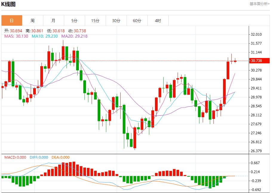 现货白银:截止北京时间20:23,现货白银上涨,现报30.751,涨幅0.13%。纽市盘前,自上午以来,白银价格没有表现出任何强劲的走势,而随机指标现在正重叠,等待推动价格恢复预期的看涨趋势,这取决于价格稳定在30.63美元以上,提醒您我们的目标是从突破31.00美元开始,为近期反弹至31.70美元铺平道路。